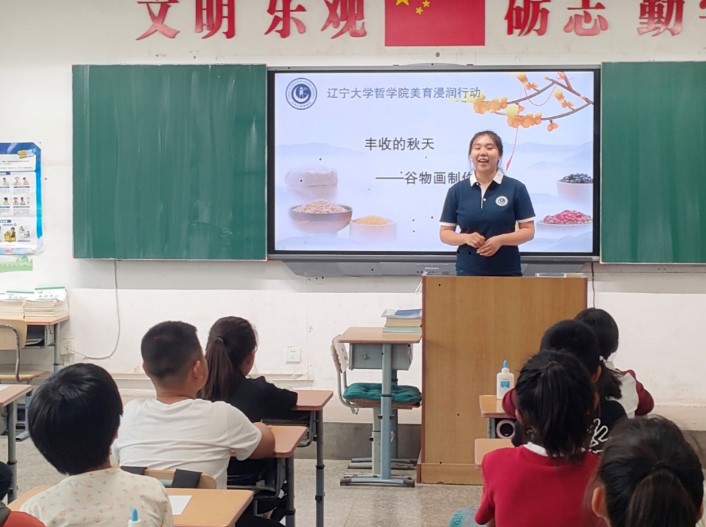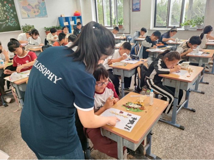 研究生梁天垚指导孩子们创作的“丰收五谷画”更是独具巧思,一颗颗玉米粒、红豆、绿豆等常见的谷物,在孩子们的排列组合下变成一幅幅充满乡土气息的生动画作,展现了收获的期许和喜悦。