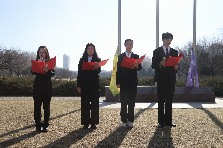 早上八点整,国旗护卫队迈着铿锵有力的步伐护送国旗入场。全体师生肃立整齐,奏唱国歌,向冉冉升起的五星红旗行注目礼。雄壮的国歌声中,浓浓的爱国之情与对革命先烈的深切缅怀在每个人心中激荡。